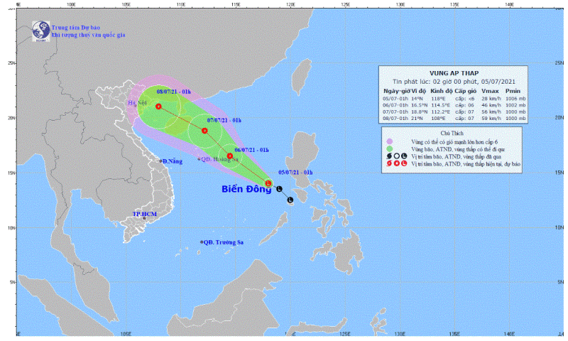 Sáng 5/7, Trung tâm Dự báo Khí tượng Thủy văn Quốc gia cho biết vùng áp thấp ở miền trung Philippines đã di chuyển vào Biển Đông. Lúc 7h, trung tâm vùng áp thấp cách quần đảo Hoàng Sa khoảng 580 km về phía đông nam.