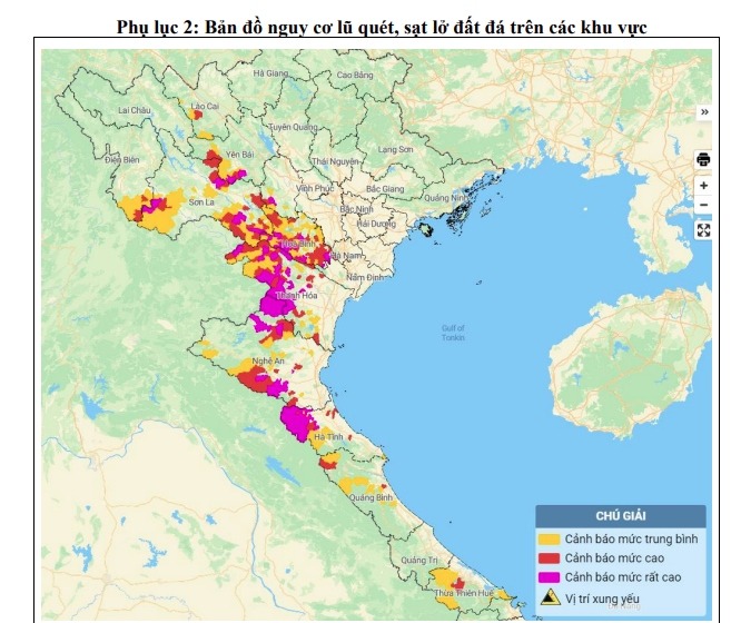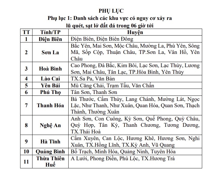 Trong 6 giờ tiếp theo, nguy cơ xảy ra lũ quét trên các sông, suối nhỏ, sạt lở đất trên sườn dốc tại nhiều huyện: