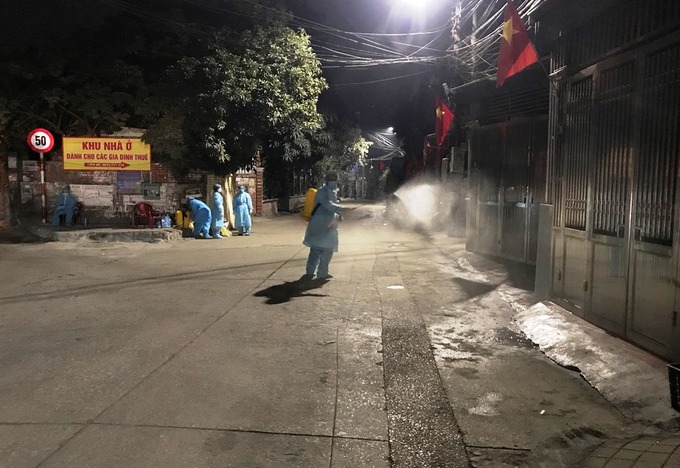 Trong đêm 27/1, tại khu dân cư ở tổ 1, khu 6, phường Hồng Hà, nơi ở của nam nhân viên Sân bay Vân Đồn, lực lượng y tế đến phun khử trùng. Công an được điều động bảo đảm an ninh trật tự.
