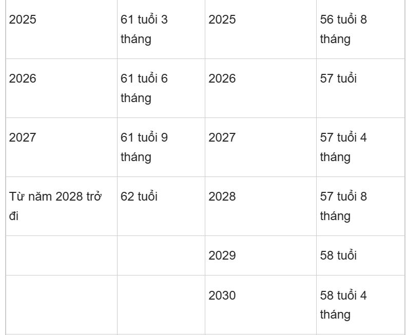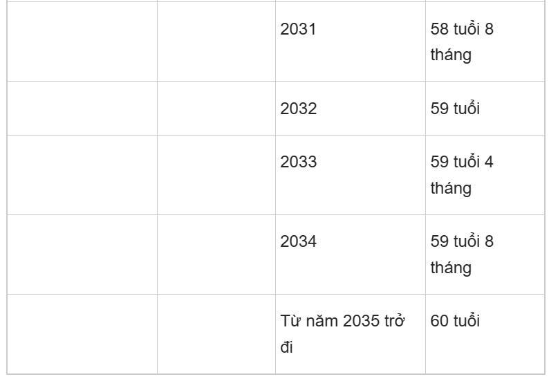 - Lộ trình điều chỉnh tuổi nghỉ hưu của người lao động quy định nêu trên được thực hiện theo bảng dưới đây: