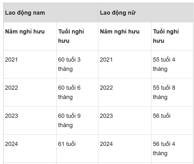 Kể từ năm 2021, tuổi nghỉ hưu của người lao động trong điều kiện lao động bình thường là đủ 60 tuổi 3 tháng đối với lao động nam và đủ 55 tuổi 4 tháng đối với lao động nữ; sau đó, cứ mỗi năm tăng thêm 3 tháng đối với lao động nam và 4 tháng đối với lao động nữ.