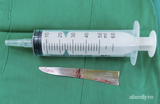 Sau gần 2 giờ phẫu thuật cấp cứu, kíp phẫu thuật đã lấy lưỡi dao ra khỏi lồng ngực bệnh nhân, vết thủng kích thước 5mm đang chảy máu, kích thước dao thái dài gần 10cm. Bệnh nhân đã vượt qua khỏi tình trạng nguy kịch