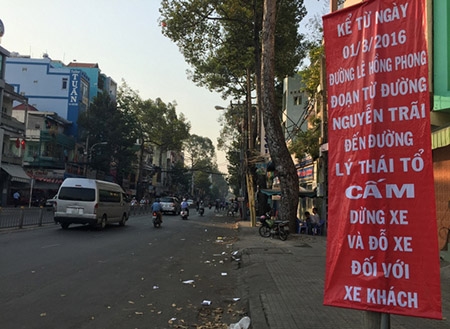 Để lập lại trật tự giao thông, Sở GTVT TP HCM vừa có văn bản chỉ đạo Khu Quản lý giao thông đô thị số 1 thực hiện việc lắp đặt biển báo cấm xe dừng đón khách trên đường Đề Thám (từ giao lộ Phạm Ngũ Lão đến Trần Hưng Đạo) và Lê Hồng Phong (từ giao lộ Nguyễn Trãi đến Lý Thái Tổ).