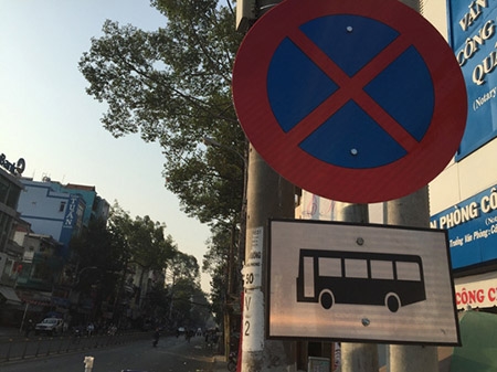Bảng cấm xe khách dừng, đỗ được Khu quản lý giao thông đô thị số 1 (Sở GTVT TP HCM) treo lên. |