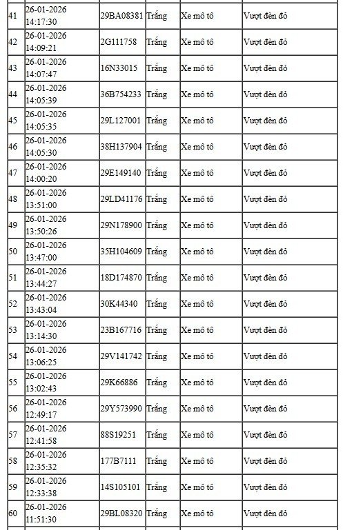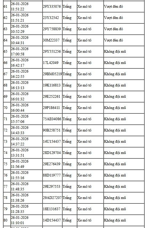 Theo dữ liệu trích xuất từ hệ thống camera AI, trong khoảng thời gian từ 12h ngày 26/1/2026 đến 12h ngày 27/1/2026, tại nút giao Phạm Văn Bạch – Hoàng Quán Chi (quận Cầu Giấy, Hà Nội), hệ thống đã phát hiện 58 trường hợp người điều khiển mô tô, xe gắn máy vượt đèn đỏ và 32 trường hợp không đội mũ bảo hiểm khi tham gia giao thông. Toàn bộ hình ảnh vi phạm đều được camera ghi nhận rõ biển số, thời gian, vị trí và hành vi vi phạm để phục vụ xử lý phạt nguội theo quy định.