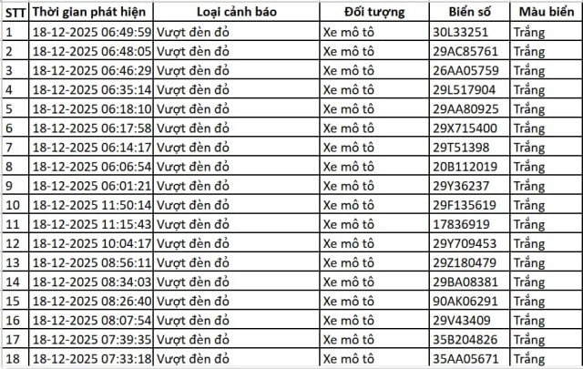Trong hai ngày 17-18/12, Cục Cảnh sát Giao thông đã công bố danh sách biển số vi phạm trật tự an toàn giao thông được phát hiện thông qua camera AI giao thông tại cao tốc Nội Bài – Lào Cai và một số nút giao trọng điểm ở nội đô Hà Nội. Tổng cộng có 113 trường hợp xe mô tô, xe máy và ô tô bị ghi nhận vi phạm, nhanh chóng được đưa vào diện xử lý phạt nguội Nghị định 168.