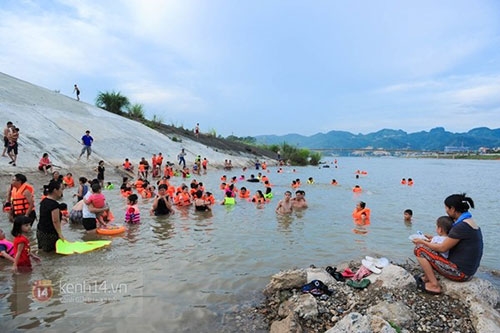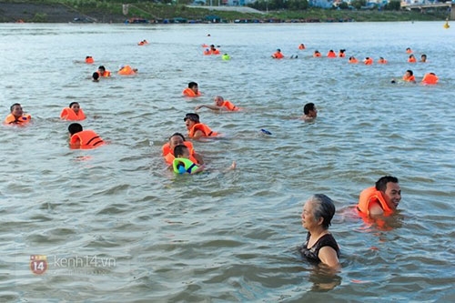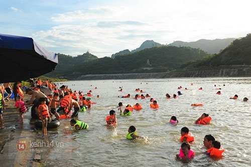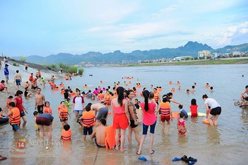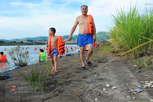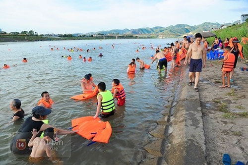 Các bãi tắm đỏ rực màu áo phao, khung cảnh chẳng khác nào các bãi biển lớn. |