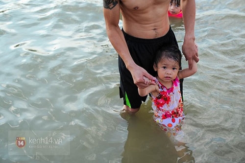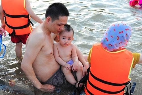 Rất nhiều trẻ em mới chỉ 2-3 tuổi, chân đi còn chưa vững cũng theo bố mẹ ra sông học bơi. |