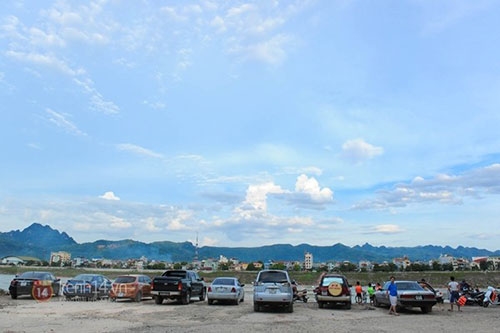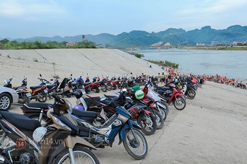 Bãi để xe chật cứng vì lượng người đổ về sông Đà quá đông. |