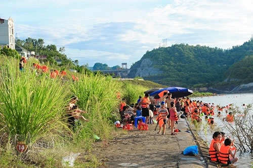 Từ 4h chiều, nhiều người dân đã bắt đầu đổ về các bãi tắm dọc hai bên bờ sông Đà. |