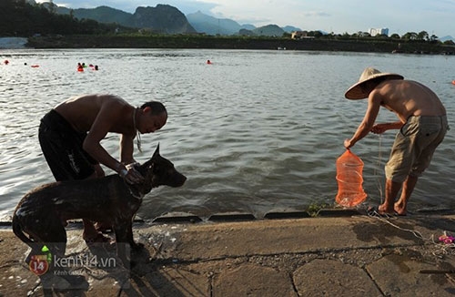 Rất nhiều thú cưng được chủ dẫn ra sông tắm. |