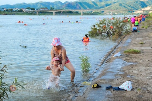 Các gia đình vô tư dẫn theo con nhỏ ra sông tắm. |