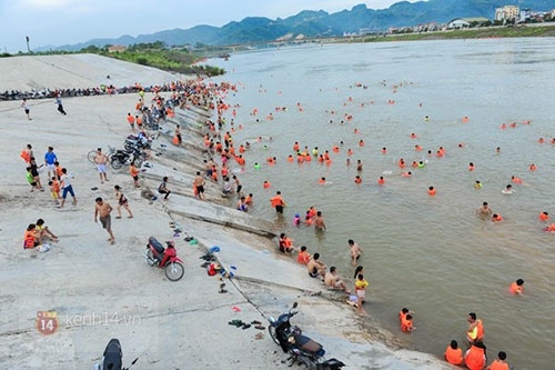 Vào khung giờ cao điểm, từ 17h đến 19h, hàng nghìn người dân kéo nhau ra khu vực bờ kè sông Đà tắm giải nhiệt. |