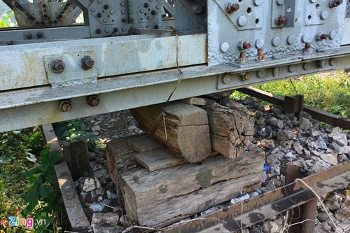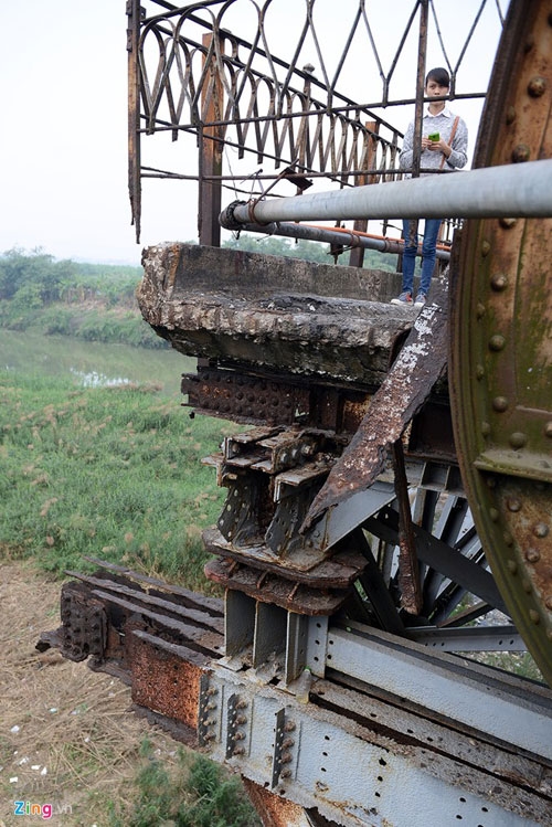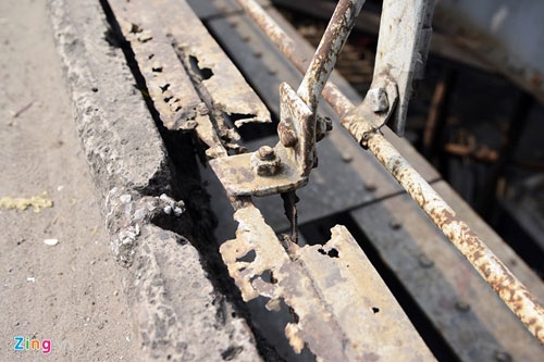 Mối nối của rào sắt giữa đường tàu và làn xe máy cũng đã bị ăn mòn nhiều điểm gây cảm giác mất an toàn. Vì cầu quá yếu, tốc độ tàu chạy qua chỉ khoảng 20 km/h. |