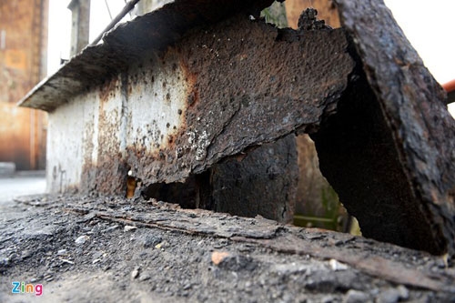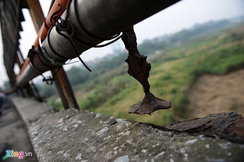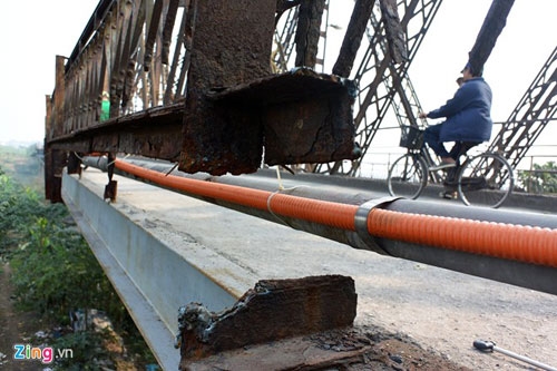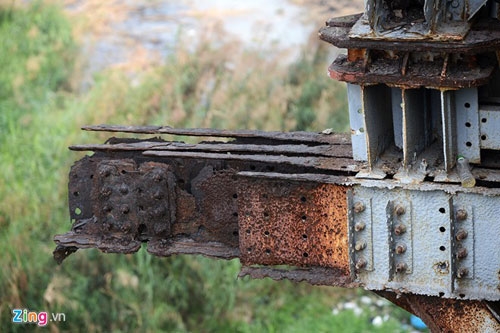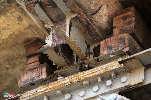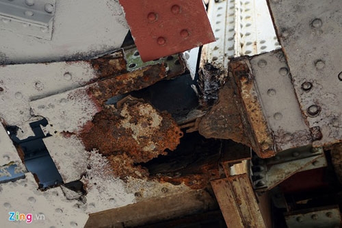 Một trong những thanh dầm gỉ nặng nhất ở vị trí giữa cột trụ số 10 và 11, hướng từ nội thành sang Gia Lâm. |