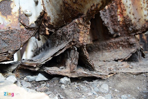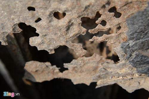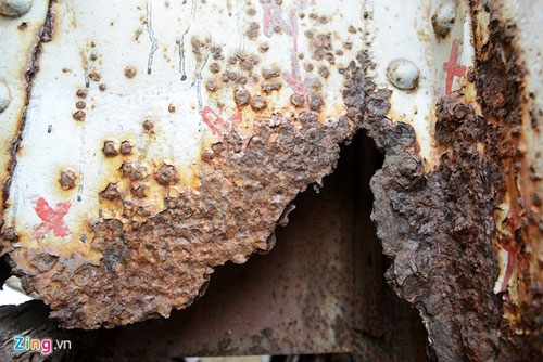 Nhiều phần thép dày tới 1 cm đã bị ăn mòn đến mỏng tang, mọt ruỗng. Nhiều người sẽ không khỏi rùng mình khi chứng kiến cây cầu có lưu lượng phương tiện tham gia hàng ngày với mật độ lớn lại đang ở trong tình trạng bong tróc nặng nề như thế này. |