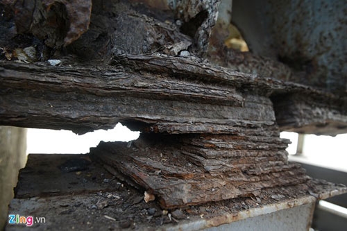 Người đi bên trên không hề biết phía dưới các thanh dầm đã bị bào mòn đến độ phải kê đỡ bằng các thanh gỗ. |