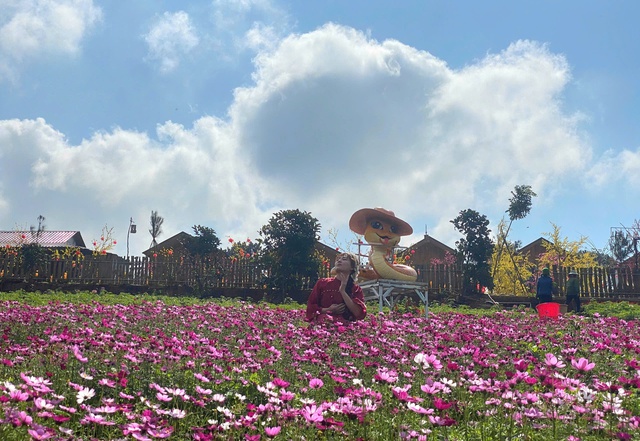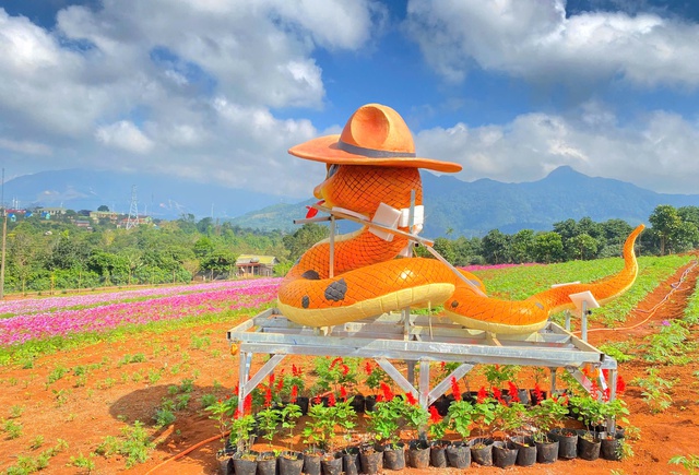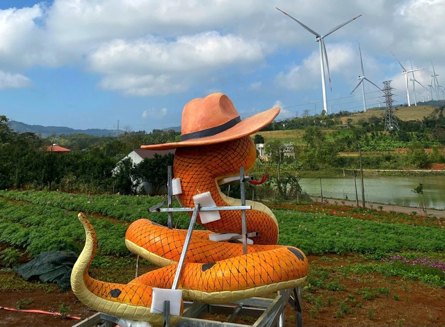 Linh vật rắn năm nay được chị Trần Thị Minh Thùy nhờ anh Tâm chế tác để đặt tại farmstay Mây Lưng Đồi (xã Hướng Tân, huyện Hướng Hóa) của mình phục vụ du khách tham quan dịp Tết Nguyên đán.