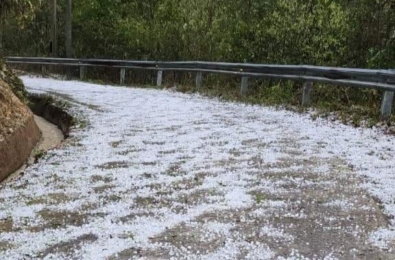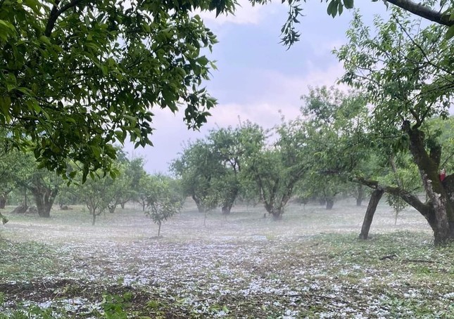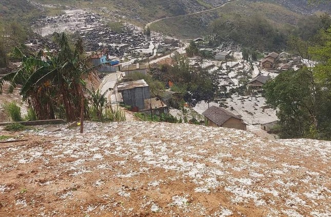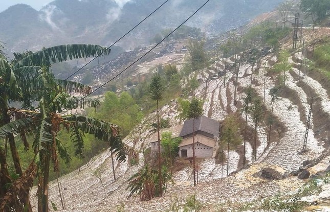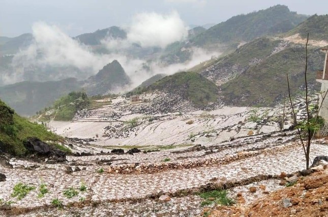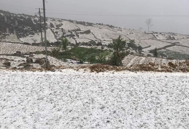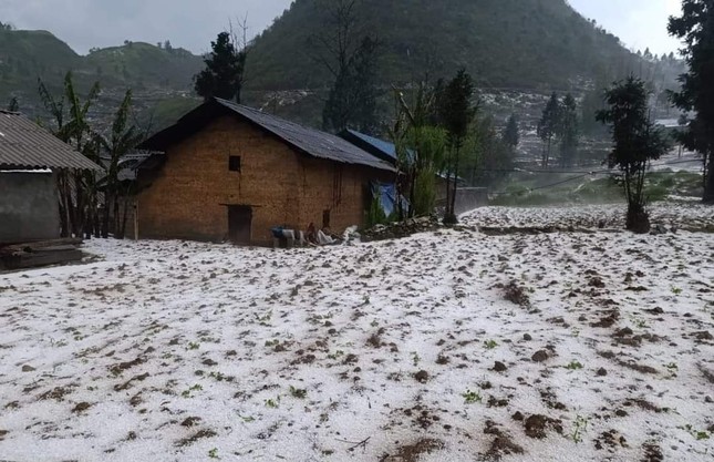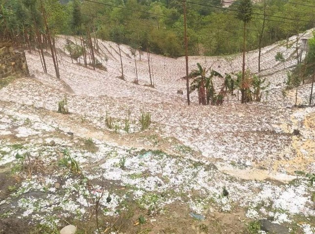 Nhiều nơi, mưa đá rơi dày đặc tạo nên khung cảnh trắng xóa khu vực đồi, núi và diện tích đất canh tác của đồng bào. Nhiều người đi đường phải nhanh chóng tìm chỗ ẩn nấp.