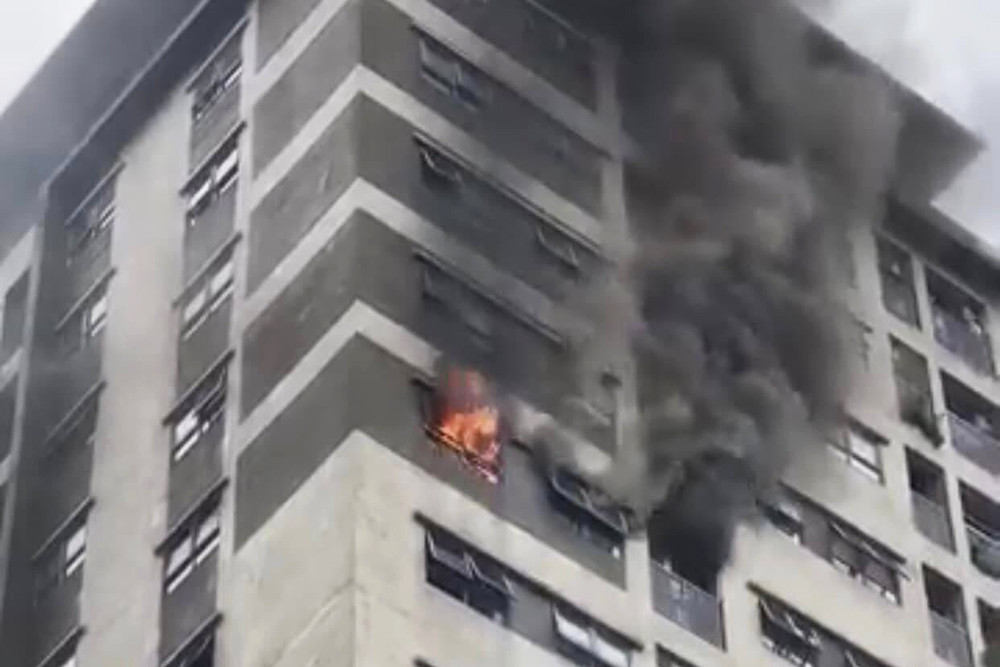 Tại hiện trường, lửa cháy rừng rực phun ra từ cửa sổ và ban công của căn hộ. Khói đen lan khắp tầng 14 và bốc ra bên ngoài.
