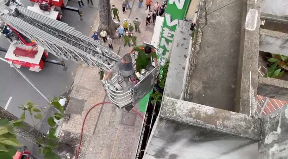 Lực lượng chức năng đã dùng xe thang giải cứu 2 người mắc kẹt trên sân thượng và hướng dẫn 6 người khác thoát nạn, tất cả được an toàn.