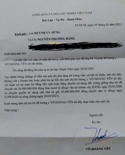 Theo đó, trong thư, ông Võ Hoàng Yên đã gửi lời cám ơn vợ chồng ông Dũng "lò vôi" đã hỗ trợ, giúp đỡ ông rất nhiều. "... trong những số tiền tiền mà anh chị đưa tặng tôi trong việc xã hội từ thiện, anh chị thấy không vừa ý khoản nào hoặc phải trả lại hết cho anh chị thì lương y VÕ HOÀNG YÊN tôi đây xin hoàn trả lại toàn bộ bằng tiền mặt hoặc bằng Quyền sử dụng đất...", thư của ông Võ Hoàng Yên viết.