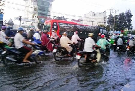 Cuối giờ chiều 5/5, cơn mưa kéo dài hơn 1 giờ đã làm cho bầu không khí trở nên mát mẻ sau nhiều ngày nóng oi bức, song nhiều tuyến đường ở trung tâm thành phố Cần Thơ đã chìm trong nước, gây khó khăn cho người dân.