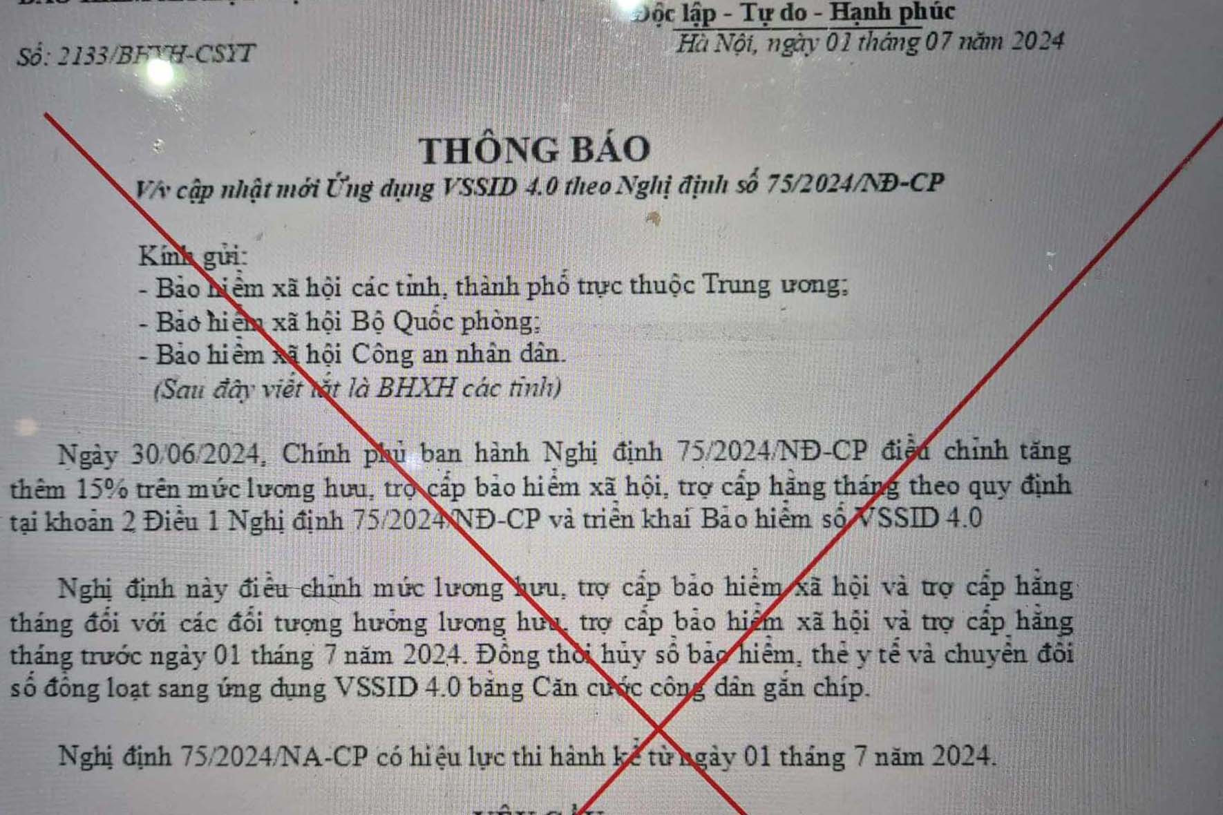 BHXH Việt Nam khẳng định, văn bản với nội dung nêu trên là giả mạo, nhằm thông tin về ứng dụng VssID 4.0 mà đối tượng lừa đảo đã lập trên app, nhằm đánh cắp thông tin cá nhân và tài khoản cá nhân, gây thiệt hại về tài chính của người dân, ảnh hưởng đến uy tín của ngành BHXH.