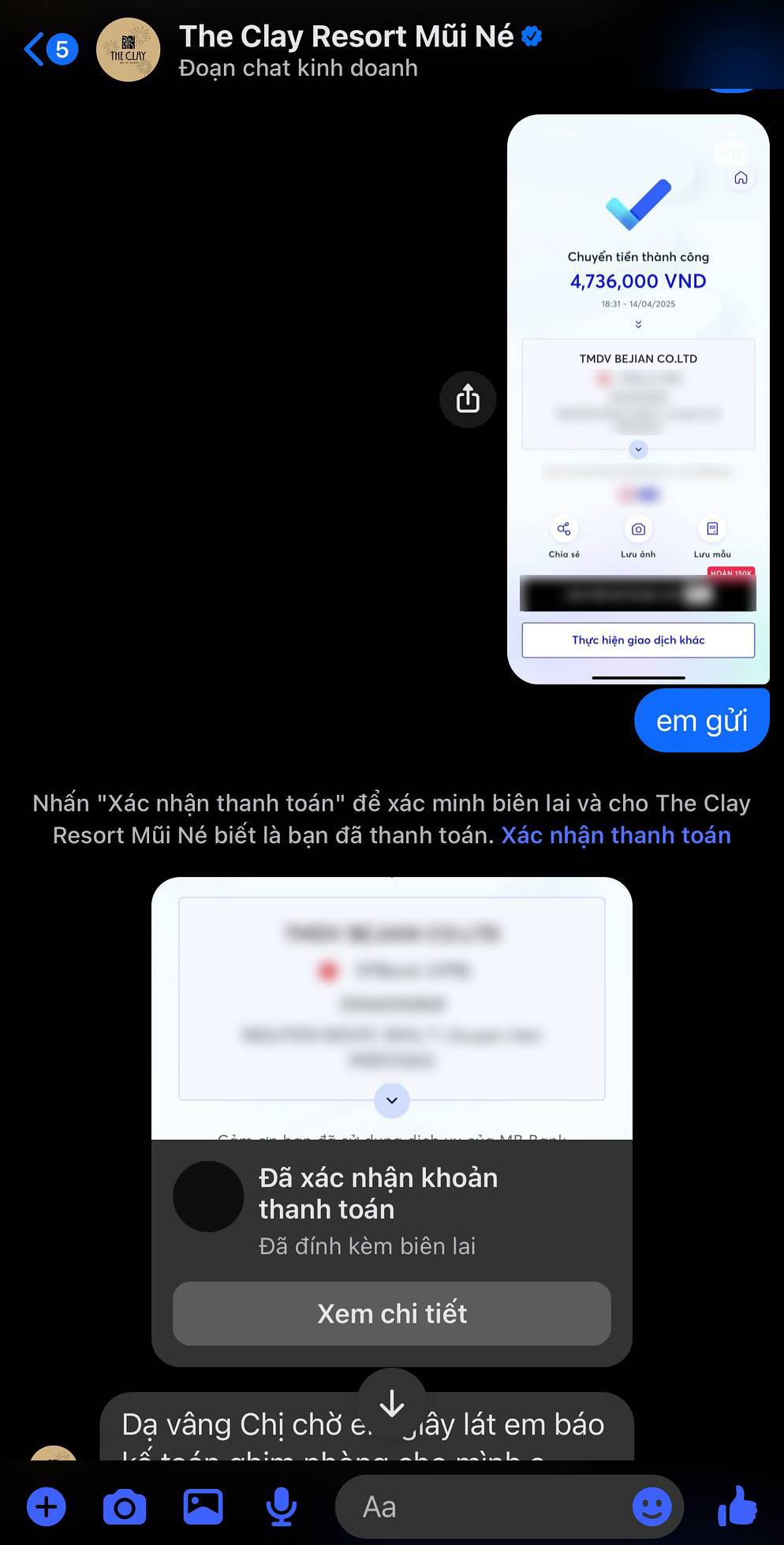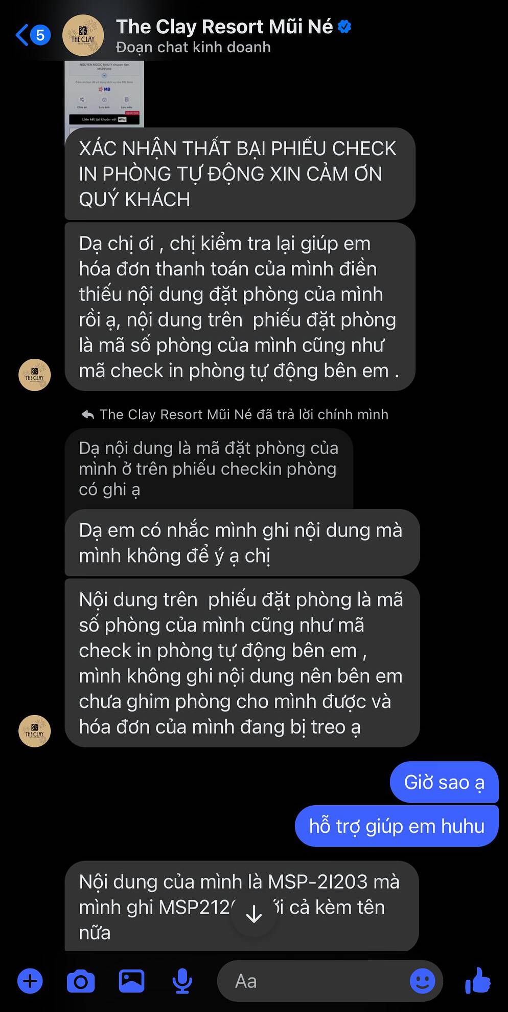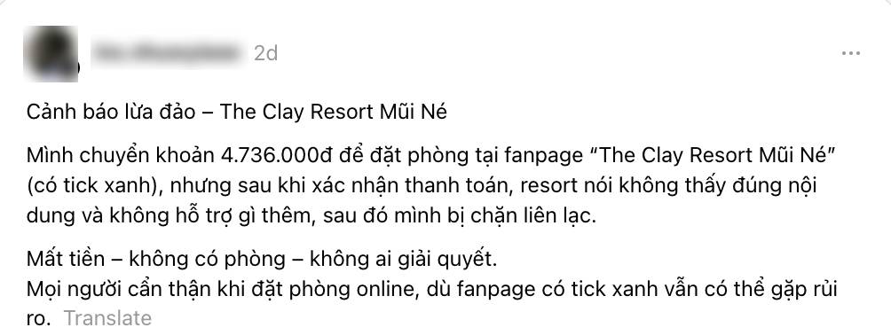 Cụ thể, cô gái đã đặt phòng tại fanpage có tên "The Clay Resort Mũi Né", có tick xanh và giao diện rất chuyên nghiệp. Tin tưởng đây là fanpage chính thức, cô không ngần ngại chuyển khoản số tiền 4.736.000 đồng để đặt phòng. Tuy nhiên sau đó, cô nhận được thông báo rằng mình chuyển "sai cú pháp" và được yêu cầu chuyển lại lần nữa. May mắn thay, cô đã sinh nghi và không chuyển thêm tiền, nhưng đồng thời cũng bị fanpage kia chặn mọi liên lạc, không thể kết nối lại.