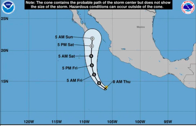 Tính đến sáng 29/5 (giờ ET), tâm bão nằm cách phía nam mũi Baja California khoảng 1.078 km, di chuyển theo hướng tây bắc với tốc độ 16 km/h, sức gió tối đa đạt 64 km/h.