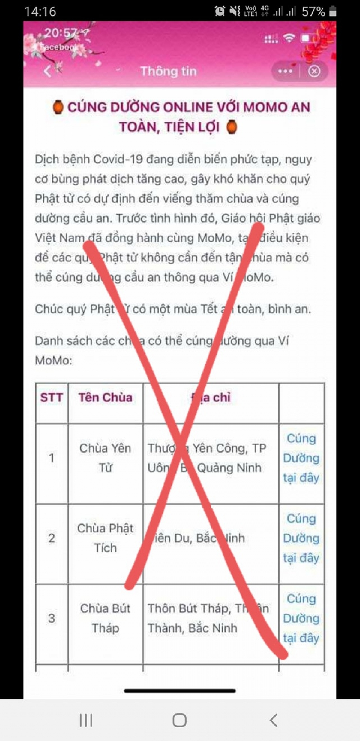 Trao đổi với VOV.VN, sư cô Thích Nữ Mai Anh (Chùa Yên Tử, Quảng Ninh) cho biết, hiện trên mạng xuất hiện nhiều trang thông tin giả mạo các chùa. Các đối tượng thường mượn uy tín của các chùa lớn như Chùa Yên Tử, Chùa Phật Tích, Chùa Bút Tháp… để kêu gọi cúng dường, cầu an thông qua ví điện tử MoMo.