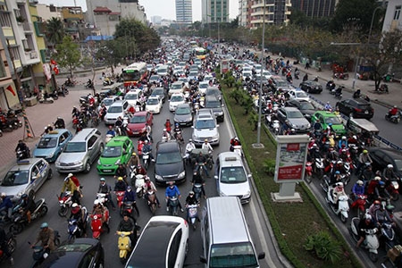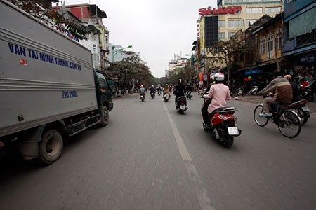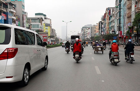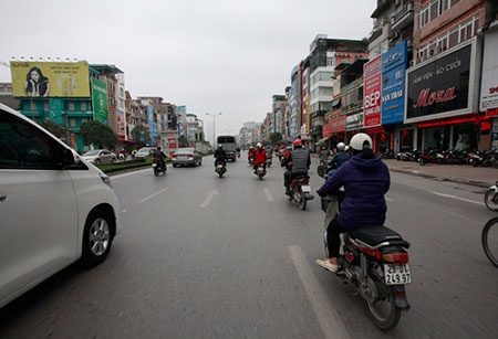 Vào giờ cao điểm, các phương tiện lưu thông trên phố Xã Đàn đã đi sang làn hàng loạt |