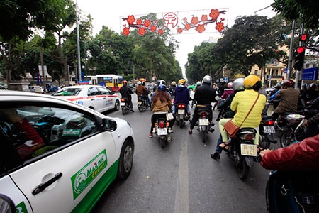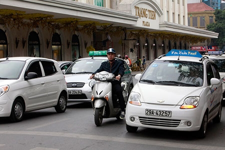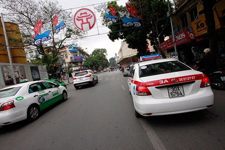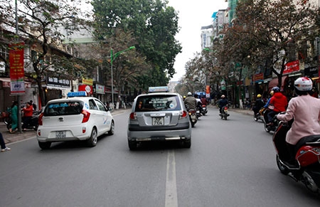 Xe taxi lấn sang làn xe máy trên phố Hàng Bài |