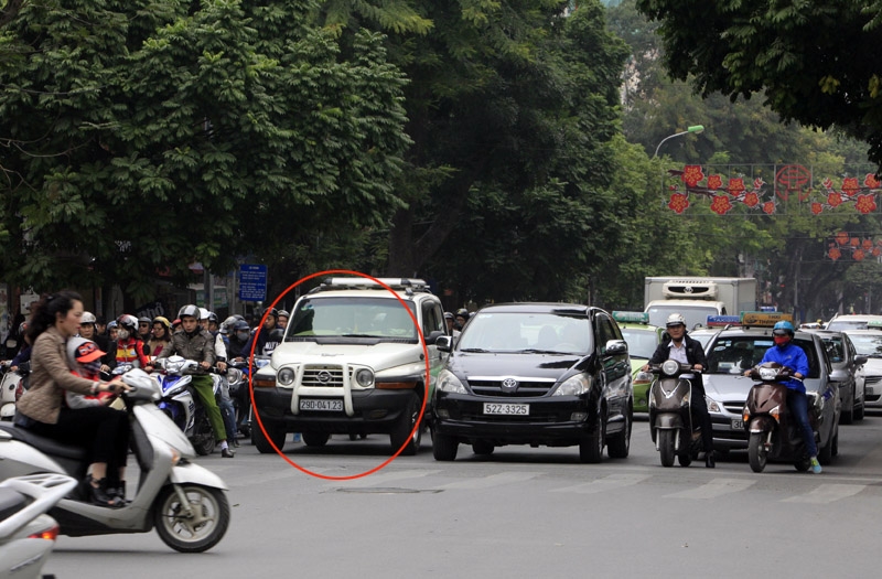 Chiếc xe ô tô (trong vòng đỏ) lấn sang làn xe máy dù không có tín hiệu rẽ phải |