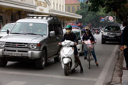 Xe máy chen giữa làn ô tô trên phố Hàng Bài |