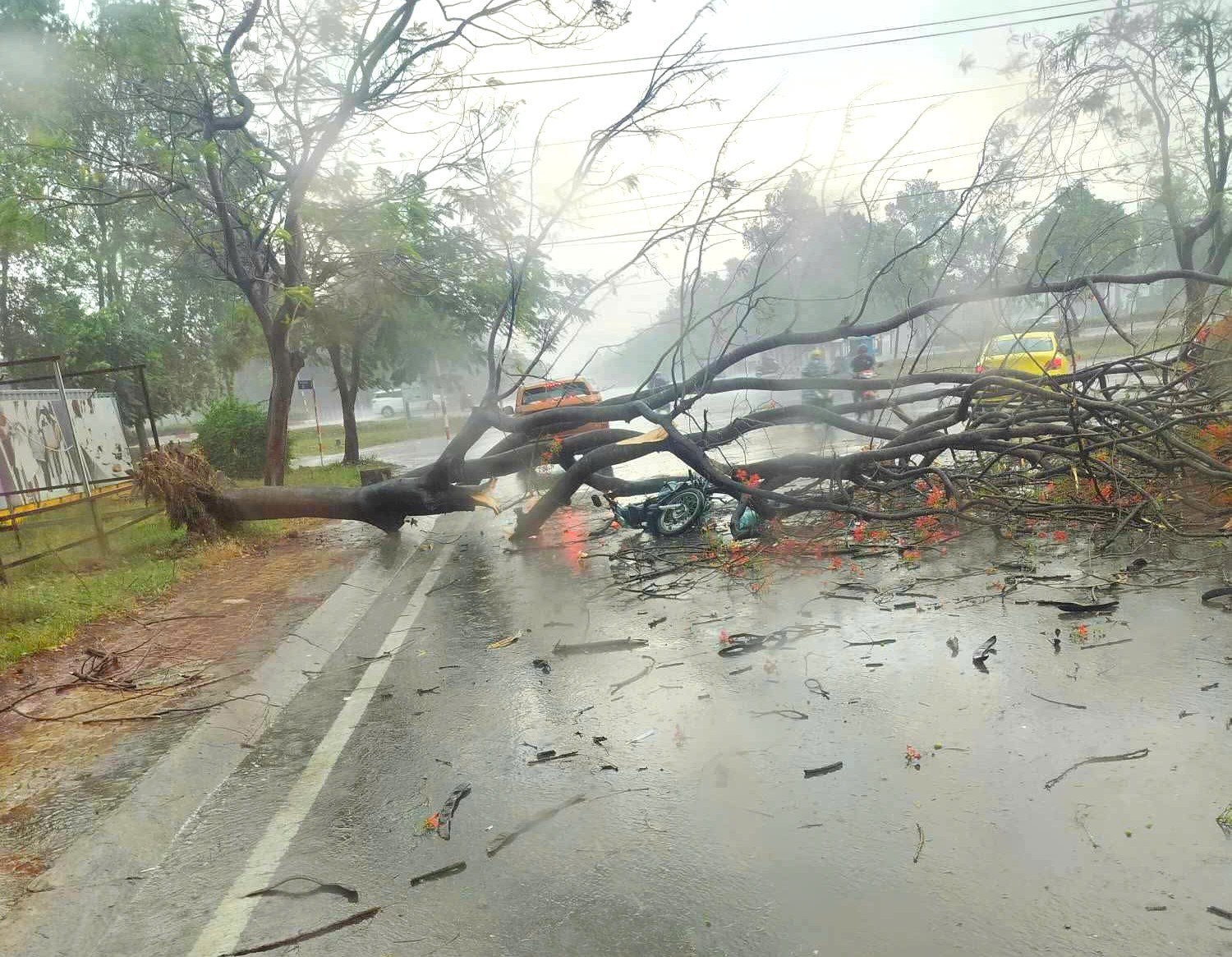 Trong đó, một cây xanh ở khu vực khu công nghiệp Nam Tân Uyên (phường Khánh Bình, TP. Tân Uyên) gãy đổ, đè trúng xe máy , làm 3 người phải nhập viện cấp cứu. Trong số ba người được đưa đi cấp cứu thì cô gái sinh năm 2009 đã tử vong tại Bệnh viện Đa khoa tỉnh Bình Dương.