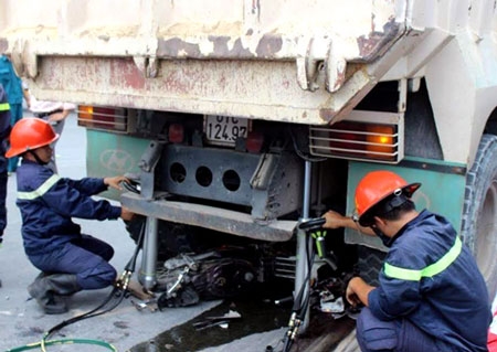 Cảnh sát cứu hộ đưa thi thể nạn nhân ra khỏi bánh xe ben. Ảnh: Nguyệt Triều. |