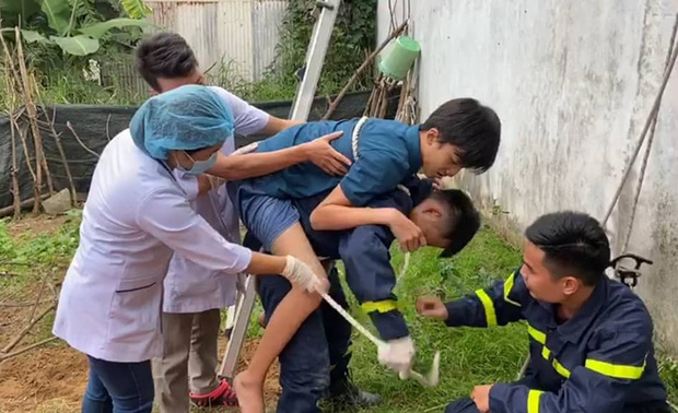 Sau khi leo lên mái nhà, kiểm tra tình hình sức khỏe nạn nhân, lực lượng cứu nạn đã cố định và cõng em Nguyên xuống đất an toàn bằng kỹ thuật tụt dây hạ chậm.