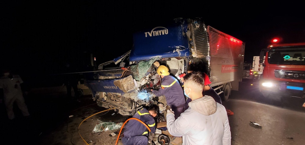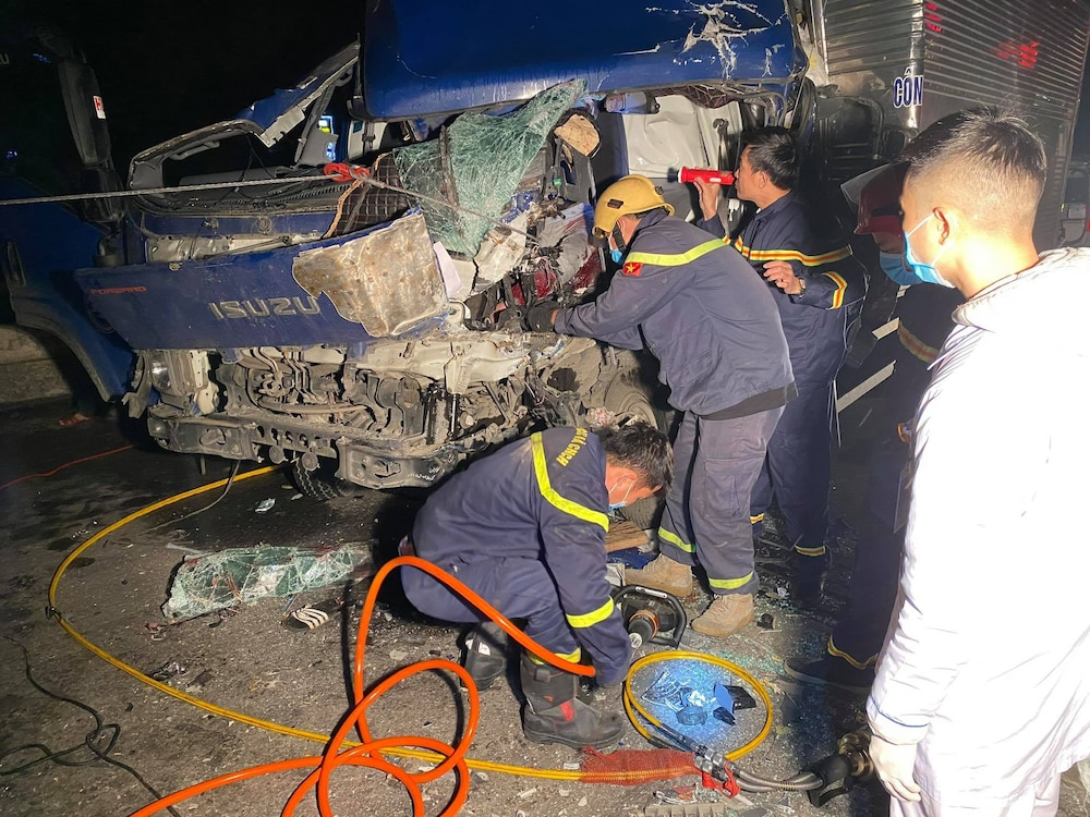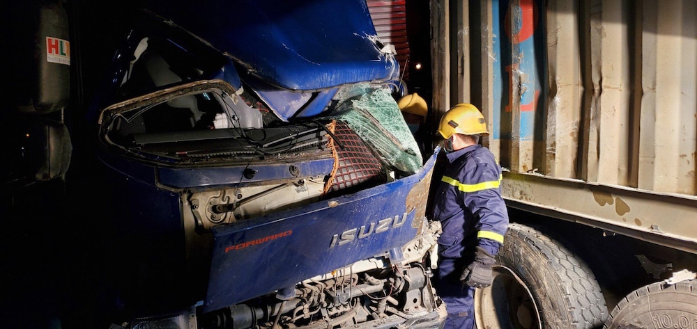 Tại hiện trường, nạn nhân là tài xế mắc kẹt trong cabin xe tải va chạm với xe container mang biển kiểm soát 29R2210. Cú va chạm mạnh khiến đầu xe tải bị biến dạng mạnh, tài xế bị thương, mắc kẹt không thể thoát ra ngoài.