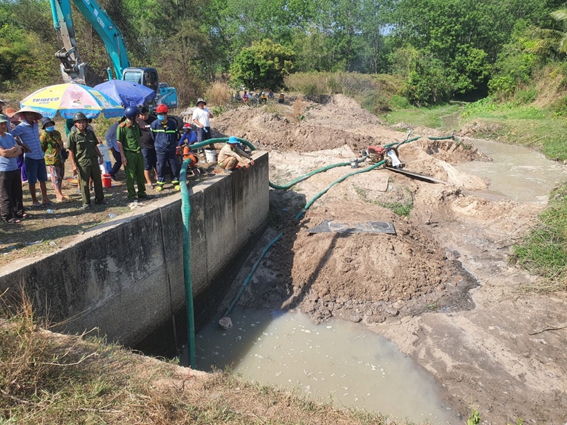 Sau gần 2 ngày, nước dưới rạch được bơm cạn và đã tìm thấy thi thể nạn nhân nằm dưới đáy.