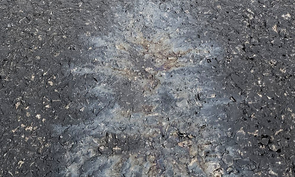 Ở một số vị trí khác, mặt đường đã bị đổ hóa chất từ trước đó. Khi lưu thông, lốp xe đã cuốn đi lớp hóa chất và nhựa đã bị phân hủy, còn trơ lại mặt đá.