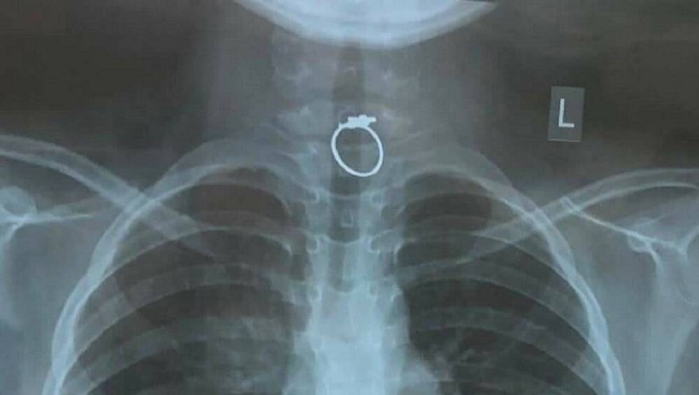 Qua chụp phim cũng như là khám cấp cứu, các bác sĩ phát hiện một chiếc nhẫn kim loại đang kẹt ở vị trí 1/3 phía trên thực quản, ghim chặt vào niêm mạc.