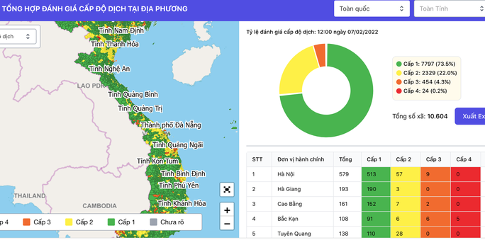 Về tỉ lệ đánh giá cấp độ dịch, cả nước hiện cơ bản là vùng xanh với 7.784 xã, phường là vùng xanh, chiếm 73,4%; Có 2.234 xã, phường thuộc vùng vàng, chiếm 22%; Có 460 xã, phường là vùng cam, chiếm 4,3%. Đến nay, cả nước chỉ còn 26 xã, phường thuộc vùng đỏ, chiếm 0,2%.
