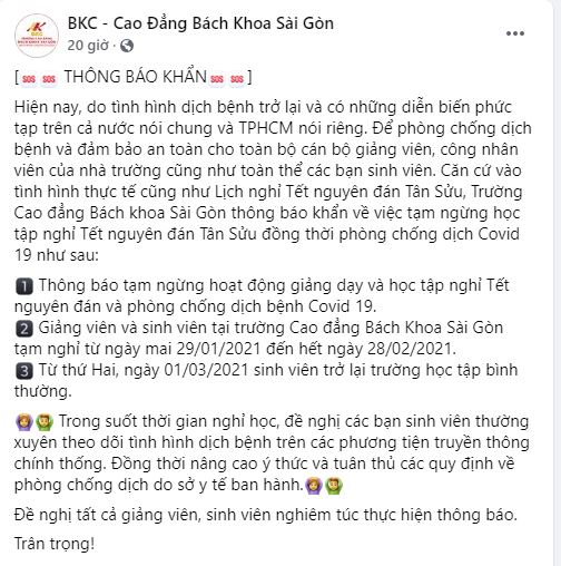 - Giảng viên và sinh viên tại trường Cao đẳng Bách Khoa Sài Gòn tạm nghỉ từ ngày mai 29/01/2021 đến hết ngày 28/02/2021.