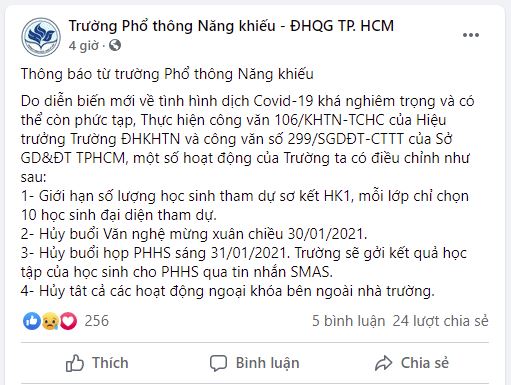 30/01/2021 03:30CẬP NHẬT: Hàng loạt trường ở TP.HCM thông báo cho học sinh, sinh viên nghỉ Tết sớm, hủy họp phụ huynh để phòng dịch