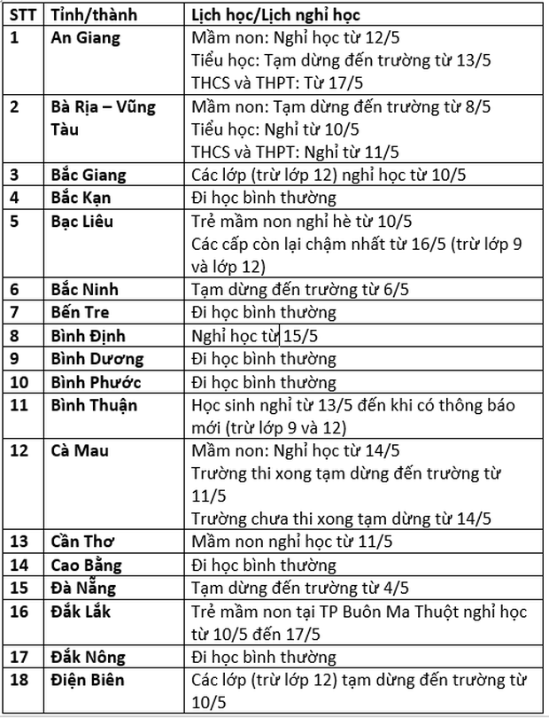 Tính đến ngày 15.5, chỉ còn gần 10 tỉnh thành thông báo cho học sinh đi học trở lại. Phần lớn địa phương đều đã cho học sinh tạm dừng đến trường hoặc cho nghỉ hè sớm để phòng chống dịch.