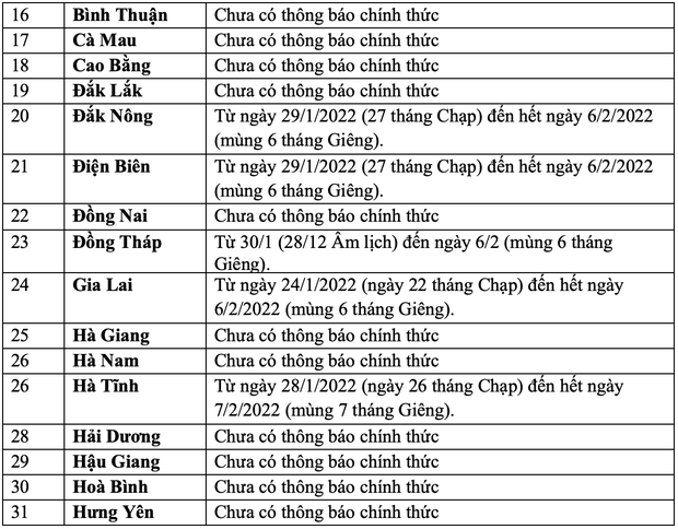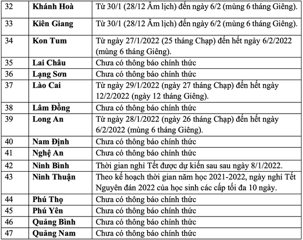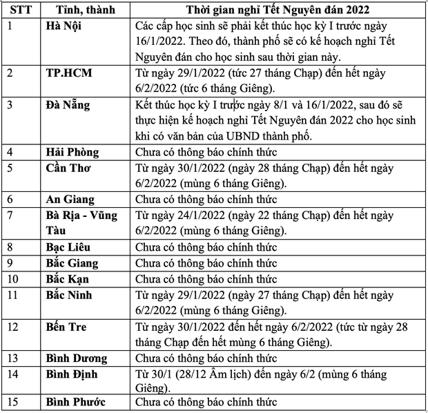 Lịch nghỉ Tết Nguyên đán 2022 của học sinh 63 tỉnh thành được cập nhật dưới đây: