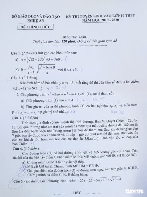 Sáng 7-6, hơn 35.800 thí sinh Nghệ An đã hoàn thành xong bài thi môn Toán - môn thi cuối cùng trong kỳ thi tuyển sinh vào lớp 10 năm học 2019-2020. Tại nhiều điểm thi ở TP Vinh, nhiều thí sinh khi được hỏi đều nhận xét đề Toán "vừa sức" và khá bám sát với hướng dẫn với cấu trúc đề tuyển sinh mà Sở GD-ĐT Nghệ An công bố.
