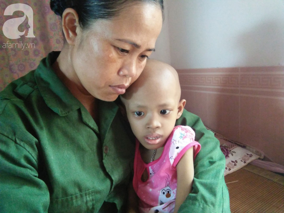 Vừa hỏi, bé Lê Thị Diệu Linh (7 tuổi, ngụ xóm 7, xã Thượng Sơn, huyện Đô Lương, tỉnh Nghệ An) mệt mỏi dựa thân hình gầy guộc của mình nép vào lòng người mẹ khóc nức nở.