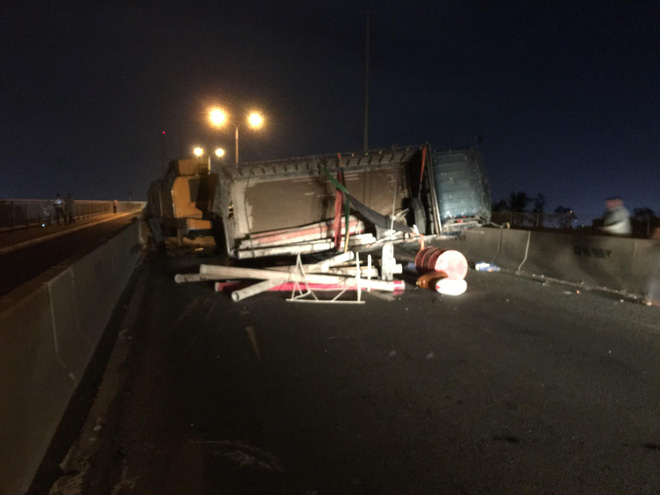 Vụ việc khiến 1 cột đèn bị hư hỏng, chiếc xe tải cũng bị biến dạng phần đầu. Tại hiện trường, chiếc xe tải nằm chắn ngang chiếm hết làn đường ô tô. Vụ vệc khiến cho giao thông qua cầu ùn ứ kéo dài nhiều giờ.